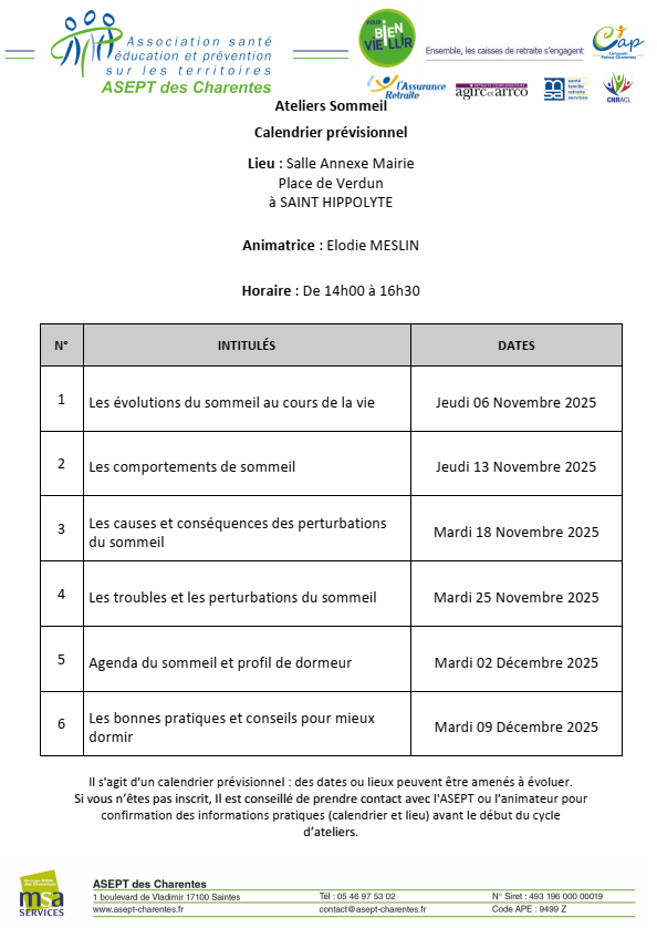 Organisés par l’ASEPT des ateliers auront lieu à SAINT HIPPOLYTE à la salle des mariages de 14H00 à 16H30 du jeudi 6 Novembre au Mardi 9 décembre suivant calendrier en annexe soit 6 séances